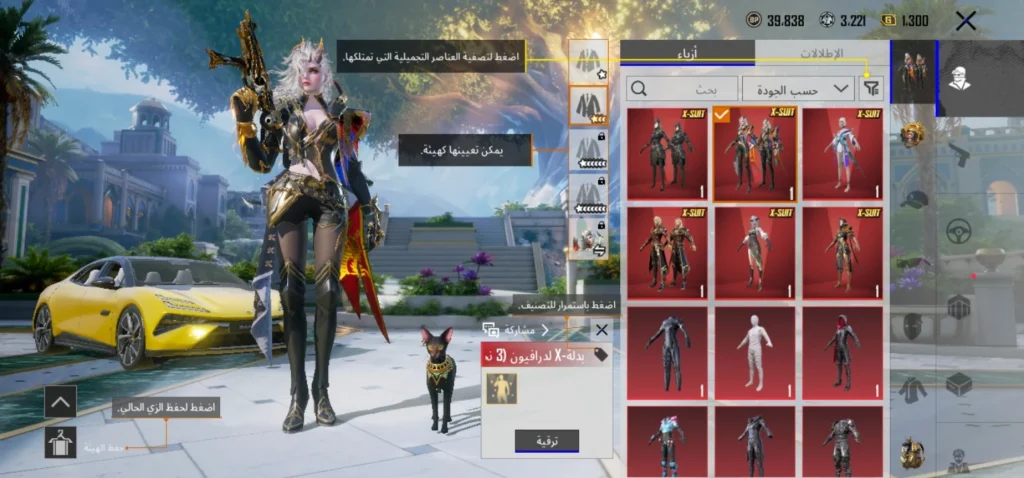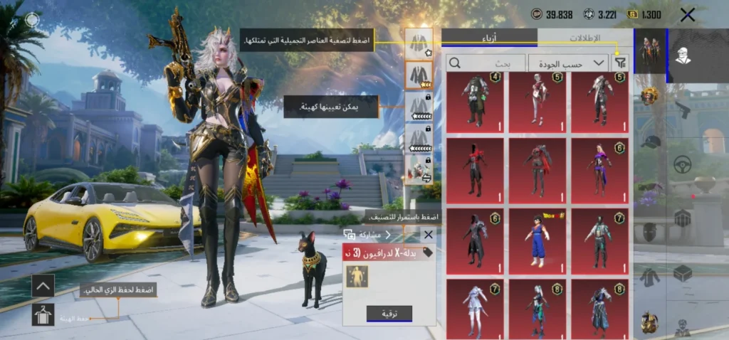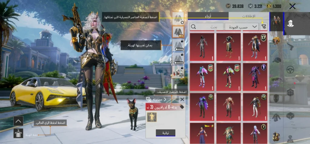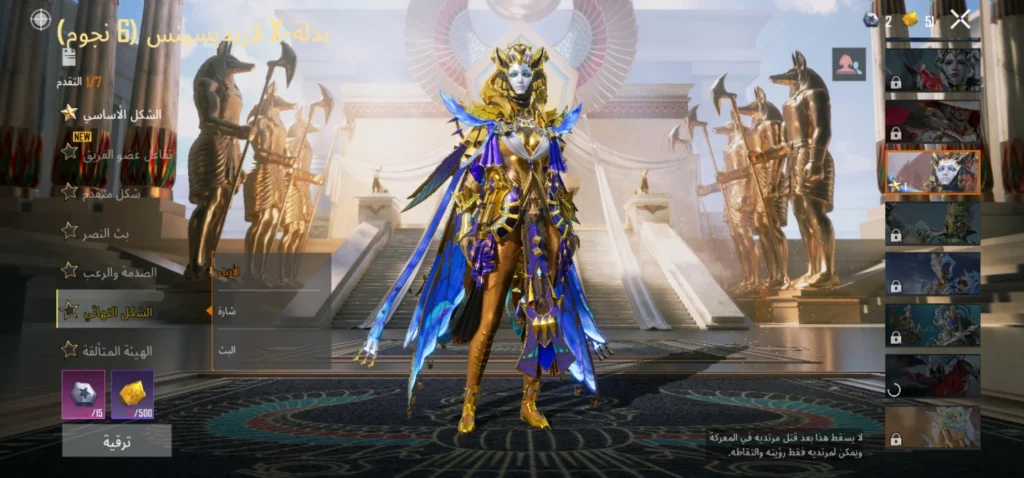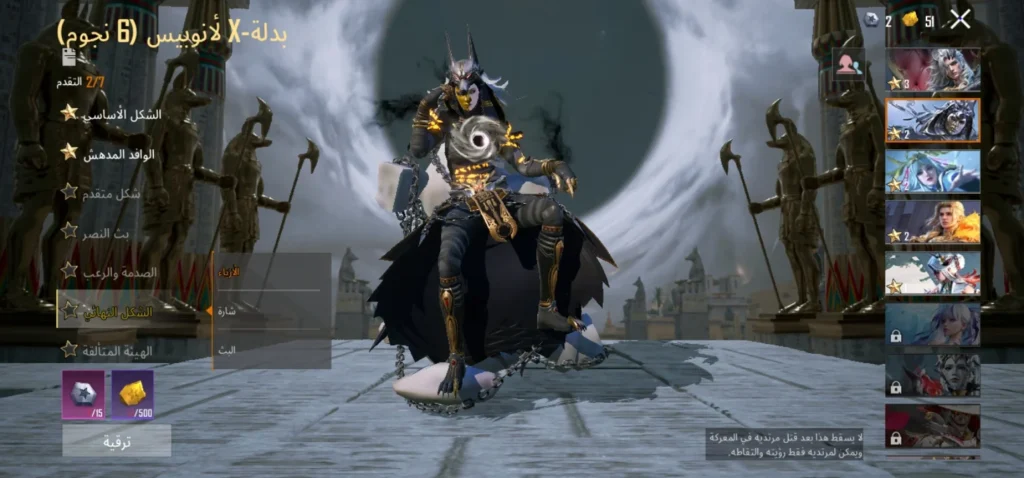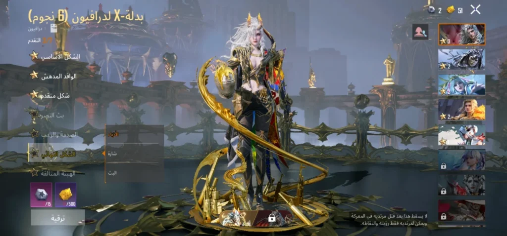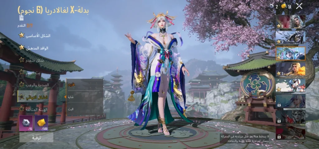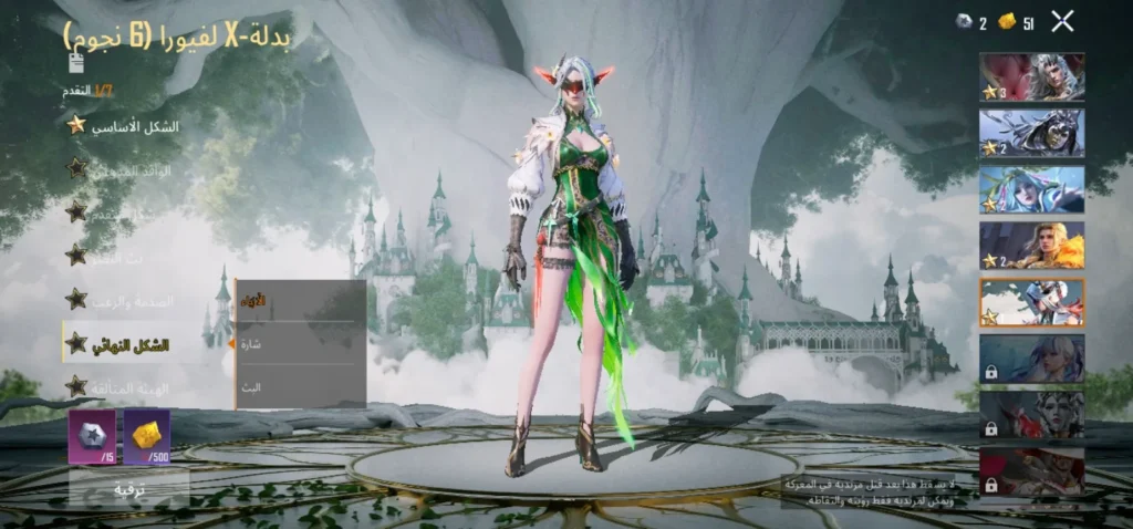 6 بدلات X ( لدرايفون ليفل 3 ،لانوبيس ليفل 2 ،لاغلادريا ليفل 2 ،لاغينس ليفل 2 ، لفيورا ليفل 1 ،لاريدسينس ليفل 1)